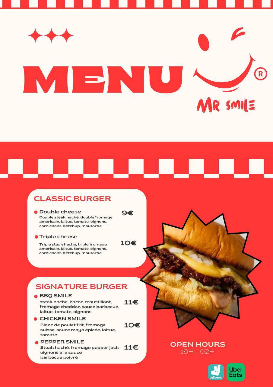 MR Smile est une marque digitale de smash burgers conçue pour maximiser les ventes sur les plateformes de livraison comme Uber Eats et Deliveroo.